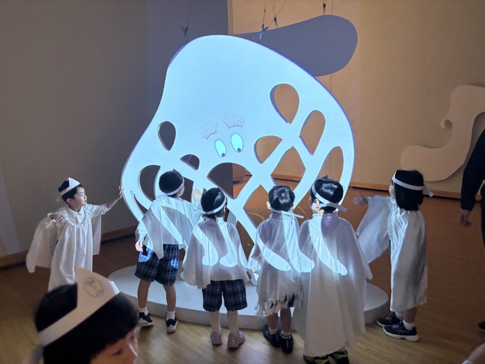 たいよう組さんが、わくわく園外保育で「オバケ?展」に行きました。白いオバケの衣装を着て館内を回り、様々なオバケの作品を見て、みんなでお風呂に入ったり、壁に映るオバケの影を追いかけたり、落語家による「ねない子だれだ」のお話を聞いたりしました。「怖い怖い」と言いながらもとても楽しんでいたこどもたちです。