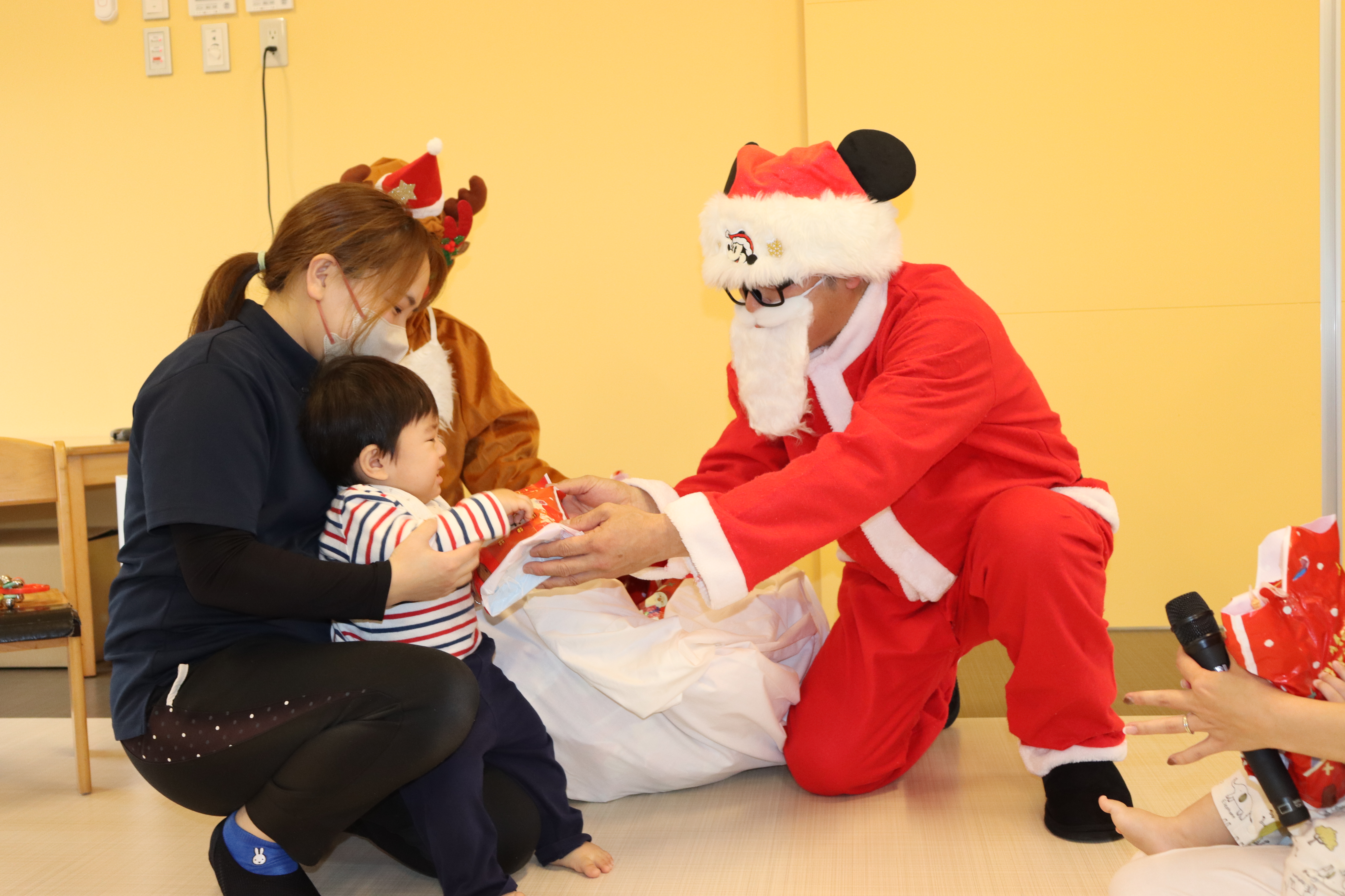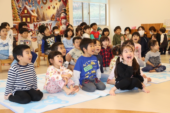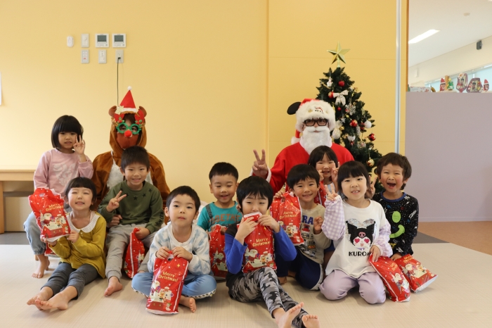 待ちに待ったクリスマス会が行われました。みんなで歌を歌い、保育者によるハンドベルやダンスの出し物を見て楽しんでいると、どこからか鈴の音が・・・みんな「サンタさんだー」とキョロキョロ探し始めました。最初にトナカイさんが登場し、サンタさんが迷子になったとのこと。みんなで大きな声で「サンタさーん」と呼ぶと、大きな袋を抱えたサンタさんが登場し大喜び。サンタさんに質問をしたり、ひとりずつプレゼントをもらったりして楽しいひと時を過ごしました。